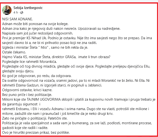 Koliki nedostatak skrupula treba imati pa pokušati sarajevsku tragediju, poginulog mladića i teško povrijeđenu djevojku koristiti za politički obračun? Upravo je to bila bila namjera opozicije u Kantonu Sarajevu, predvođene Strankom demokratske akcije. Objava „prve dame SDA“ Sebije Izetbegović dovoljno je ilustrativna.